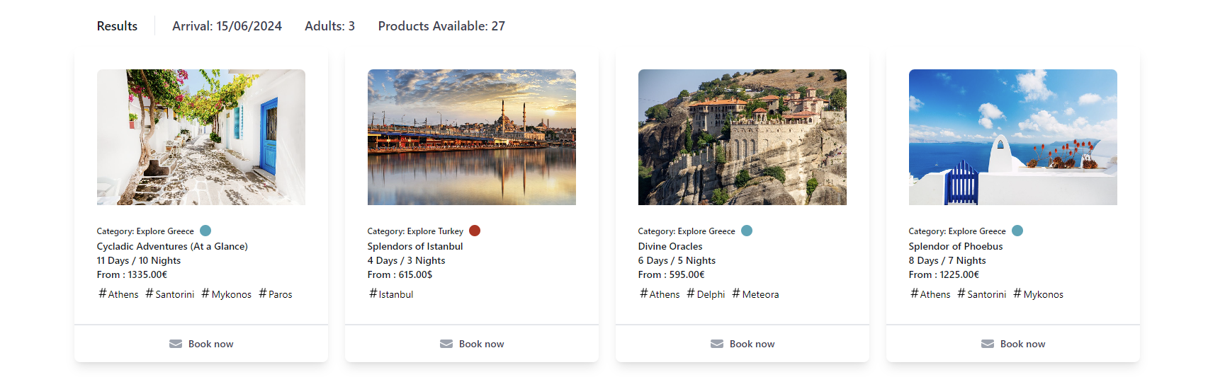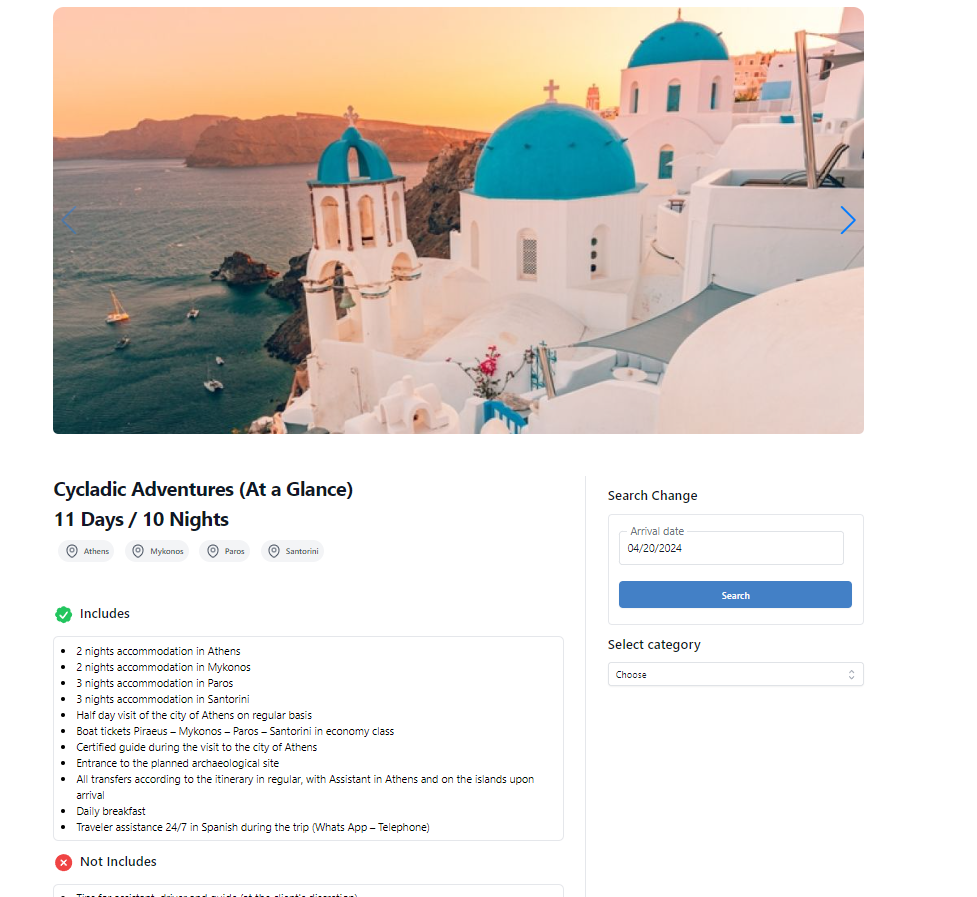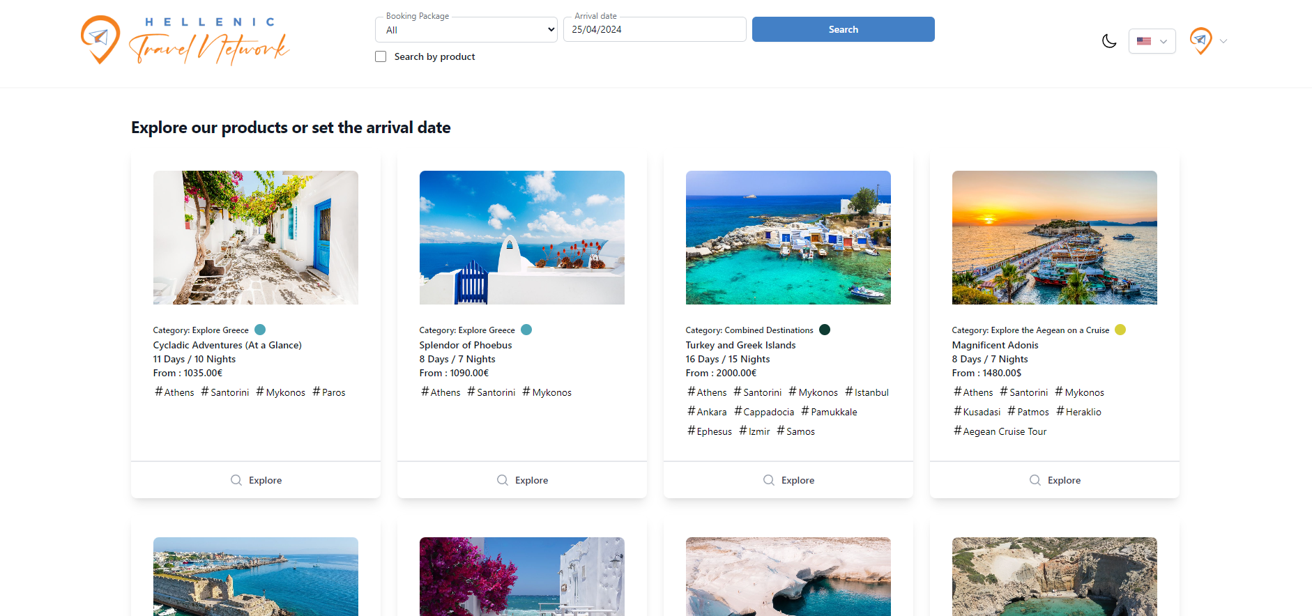 If no available products are found through the search, you will see the 'Explore our Products' title. This functionality displays all of Hellenic Travel Network Products and, if you proceed to book, you will need to set arrival date in the next step