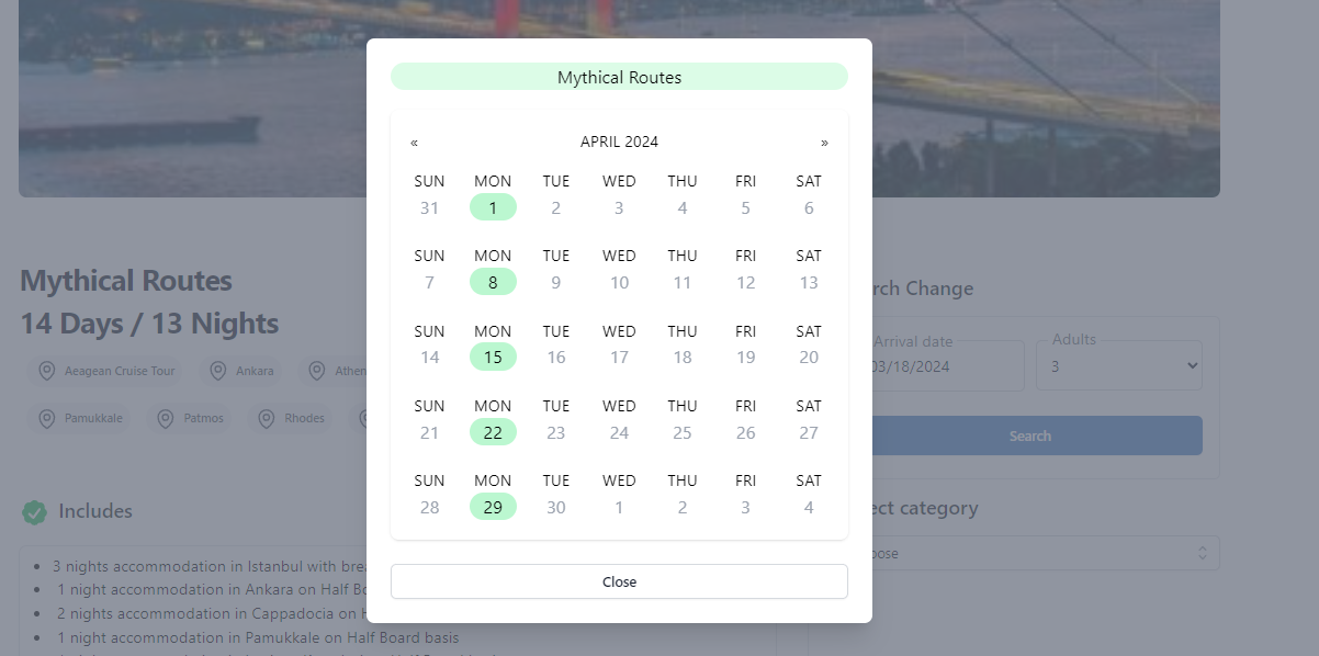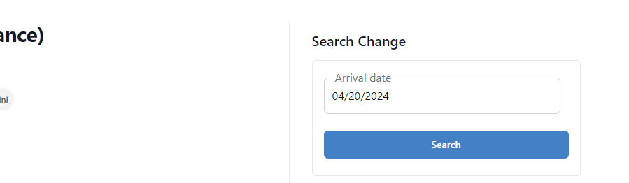 You can modify your initial search results by selecting an arrival date from our search bar. Simply click on 'Change Date' to open a pop-up window displaying all available dates and months for the specific product you navigated from 'Book Now'. Once you've chosen a new arrival date, the page will update to display the corresponding prices for your selected date.